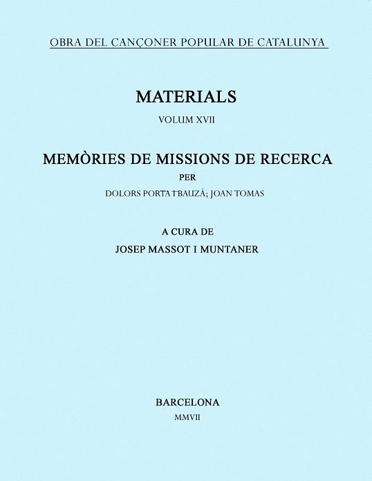 Edició de les memòries corresponents a les missions de recollida de cançons populars de Dolors Porta, als voltants de Palma de Mallorca, els estius de 1934 i de 1935; i de Joan Tomàs i Joan Llongueres i Galí, per la vall de Ribes, la Cerdanya i el Beridà, l?estiu de 1935, les darreres que va dur a terme l?Obra del Cançoner abans del col·lapse de la guerra civil.