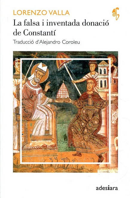 \viewkind4\uc1\pard\lang3082\f0\fs16 Durant l\rquote edat mitjana, l\rquote Esgl\'e9sia va basar el seu poder terrenal en l\rquote anomenada donaci\'f3 de Constant\'ed (Constitutum Constantini), un decret en virtut del qual l\rquote emperador, en traslladar la seu de l\rquote imperi a Constantinoble, feia donaci\'f3 al papa Silvestre I dels territoris que conformaven l\rquote imperi rom\'e0 d\rquote Occident. Gaireb\'e9 mil anys despr\'e9s, Lorenzo Valla, armat nom\'e9s amb l\rquote escut de la veritat i amb els dards punyents de la hist\'f2ria i la filologia, va demostrar de manera inequ\'edvoca la falsedat del document i f\'e9u sortir a la llum, gr\'e0cies a aquest llibre, un dels enganys m\'e9s s\'f2rdids i vergonyosos de la c\'faria romana.