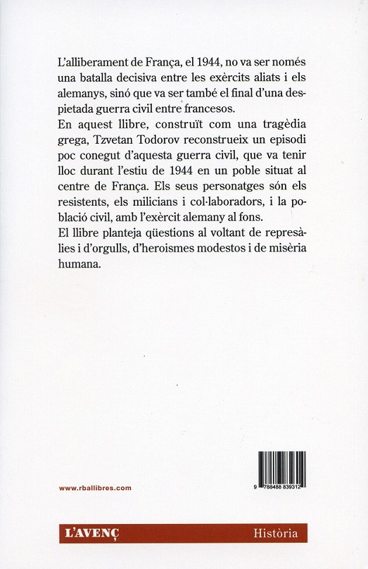 \viewkind4\uc1\pard\sb100\sa100\lang3082\f0\fs24 L\rquote alliberament de Fran\'e7a, el 1944, no va ser nom\'e9s una batalla decisiva entre les ex\'e8rcits aliats i els alemanys, sin\'f3 que va ser tamb\'e9 el final d\rquote una despietada guerra civil entre francesos. En aquest llibre, constru\'eft com una trag\'e8dia grega, Tzvetan Todorov reconstrueix un episodi poc conegut d\rquote aquesta guerra civil, que va tenir lloc durant l\rquote estiu de 1944 en un poble situat al centre de Fran\'e7a. Els seus personatges s\'f3n els resistents, els milicians i col\'b7laboradors, i la poblaci\'f3 civil, amb l\rquote ex\'e8rcit alemany al fons. El llibre planteja q\'fcestions al voltant de repres\'e0lies i d\rquote orgulls, d\rquote heroismes modestos i de mis\'e8ria humana.