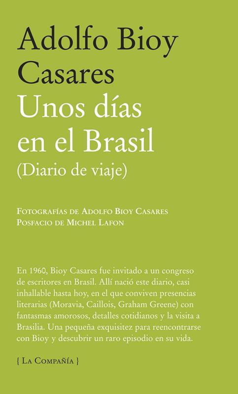 Las páginas prácticamente inéditas de Unos días en el Brasil (Diario de viaje) recogen el diario de un viaje en 1960, motivado por la invitación que Bioy Casares recibe de la organización del congreso del PEN Club en Brasil. Unos días en el Brasil recorre aquellos días de 1960 que Bioy estuvo entre las ciudades de Río de Janeiro, São Paulo y una incipiente Brasilia, de la que se celebra su 50º Aniversario como capital de Brasil. Testimonio de uno de los autores claves de la literatura en castellano del siglo XX, este diario se completa con una serie de fotos inéditas de este viaje. Coincidiendo con el lanzamiento, se celebrará una exposición titulada Basilia 1960. Fotografías inéditas de Adolfo Bioy Casares en la Galería Guayasamín de Casa de América en Madrid del lunes 6 de septiembre al domingo 19. La construcción de la ciudad comenzó en 1956, siendo Ludo Costa el principal urbanista y Oscar Niemeyer el principal arquitecto. En 1960, se convirtió oficialmente en la capital de Brasil. Junto con Putrajaya (la capital administrativa de Malasia) y Naypydaw (la nueva capital de Birmania) es una de las ciudades capitales de más reciente construcción en el mundo. El 8 de septiembre a las 20 horas será la presentación del libro en Casa de América. El acto contará con la presencia de Eduardo Berti, Juan Casamayor y muy especialmente del editor, traductor y ensayista francés Michel Lafon, que esos días concederá entrevistas. Según palabras recogidas en su posfacio, el diario tiene un cometido íntimo y personal del autor "para seguir transformando cualquier día de su vida en un viaje y una aventura, cualquier lugar del mundo en una isla encantada, donde todo se vuelve posible, e incluso deseable". Lafon mantiene que Bioy " no sabe por qué aceptó la invitación, no tiene nada que decirles a los otros invitados, rechaza las amistades obligadas y los ejercicios impuestos, odia la retórica vacía, no quiere hablar en público". Aun así, Lafon acaba preguntándose: "Viajar para escribir, escribir para olvidarse de que uno está viajando, y para recordarlo después. ¿Y si Bioy fuera el mayor diarista del continente?".