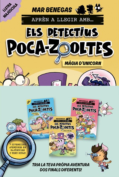 Els llibres Poca-zooltes 4, Poca-zooltes 5 i Poca-zooltes 6 de la col·lecció Aprèn a llegir amb Els detectius Poca-zooltes retractilats per aprendre a llegir amb lletra majúscula, text rimat i un gran suport de il·lustracions.